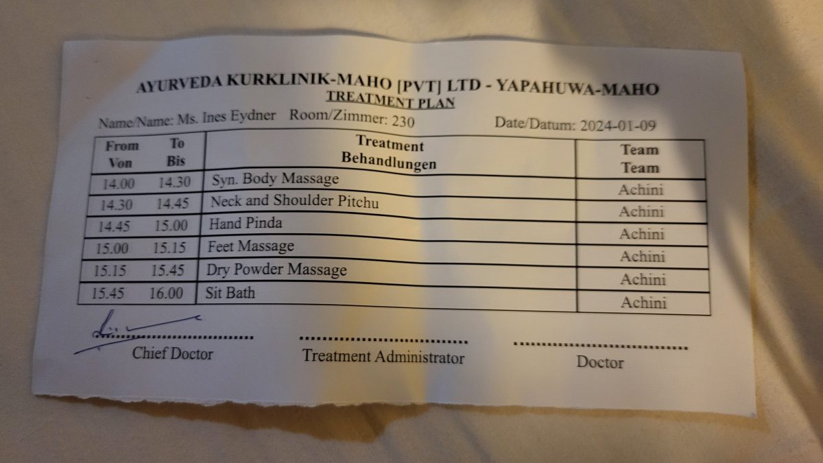 Die Welt des Ayurveda wird noch drei Tage unser kurzweiliges Zuhause sein. Die heilende Reise durch individuelle Behandlungen, neigt sich dem Ende zu. In den vergangenen Tagen habe ich täglich sechs Behandlungen mit frisch zubereiteten Kräuterölen erhalten. Der Beginn mit Abführmittel um Altlasten loszuwerden, mag etwas unangenehm erscheinen, aber er markiert den Beginn einer tiefgreifenden Reinigung. Unser Darm wird sorgfältig vorbereitet, um den Weg für die Aufnahme essentieller Nährstoffe zu ebnen.